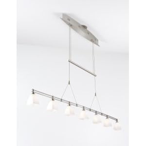 Product Description : The height of this low-voltage pendant is easily adjusted with the hand-polished counter-weight. Seven 20-Watt Halostar bulbs by Osram and hand-blown glass provide soft even lighting.This fixture utilizes an electronic line-voltage 120 V input to low-voltage 12 V output transformer by Lightech. If you are planning to use a dimmer with this fixture we recommend using a Lutron ELV electronic low-voltage style dimmer. This fixture includes a 175-Watt transformer allowing for a 20-Watt maximum per bulb. Design and utilities patent pending.